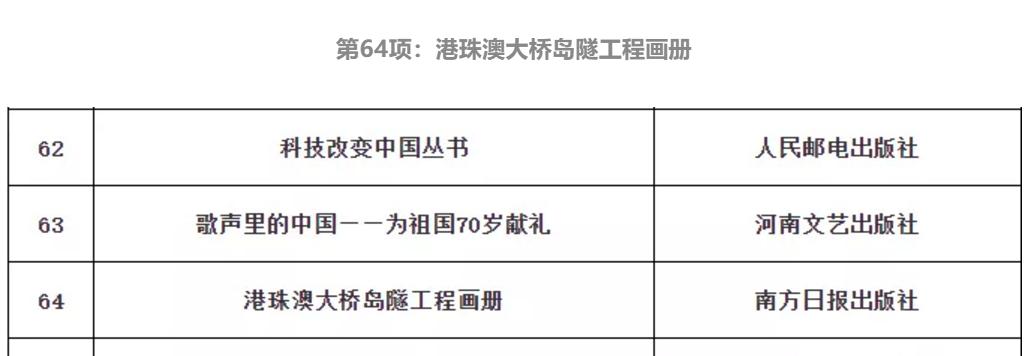 根據(jù)《中央宣傳部辦公廳關(guān)于做好2019年主題出版工作的通知》,各地區(qū)各部門各出版單位精心組織上報主題出版選題1857種,其中圖書選題1670種、音像電子出版物選題187種。經(jīng)過集中評審,最終確定2019年主題出版重點(diǎn)出版物選題90種,其中圖書選題77種、音像電子出版物選題13種?!陡壑榘拇髽驆u隧工程畫冊》“金榜題名”。