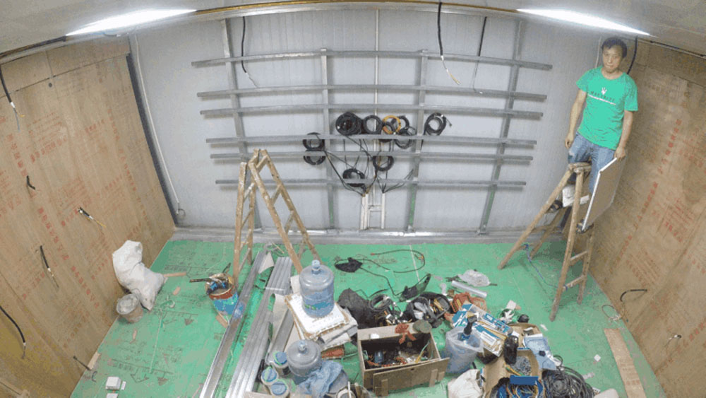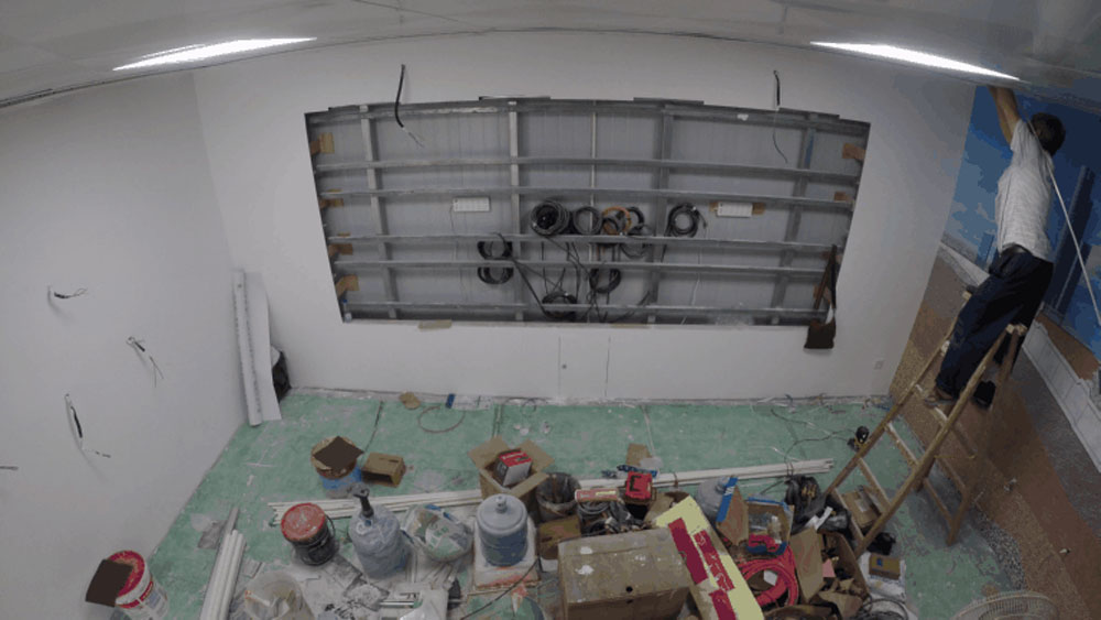 墻面基本工作完成后,開(kāi)始進(jìn)行墻面修飾,噴繪高清貼畫(huà),并對(duì)LED電路、天花板氛圍燈進(jìn)行鋪設(shè),以及烤漆構(gòu)建安裝工作