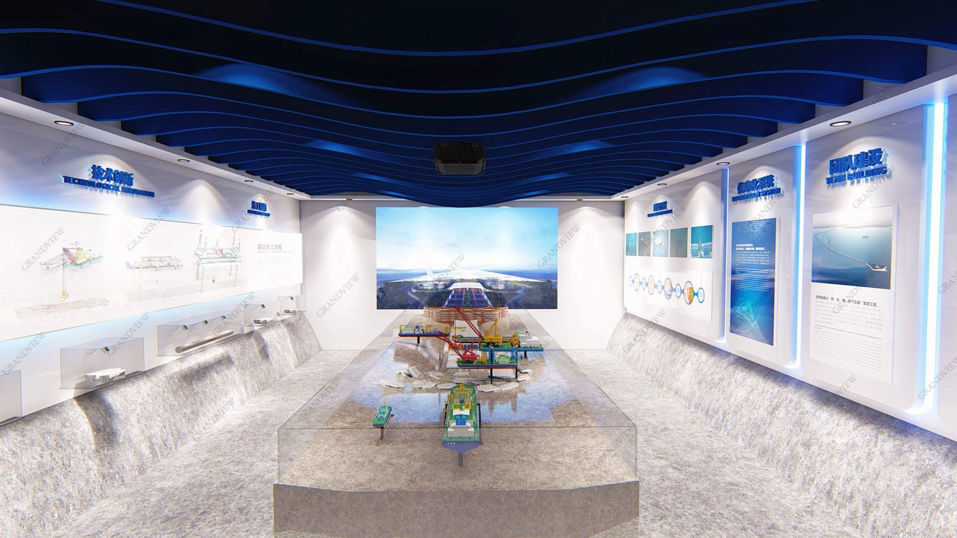 廣航局展廳根據沉管安裝和東西人工島建設,采用深塢門及沉管元素打造,按照施工的流程做成長達8米的巨型沙盤模型,外觀形象、顏色鮮明,并以波浪形的頂部格柵和黃褐色的地基展示海上及海下場景,線條極其優(yōu)美簡約。