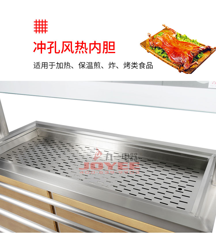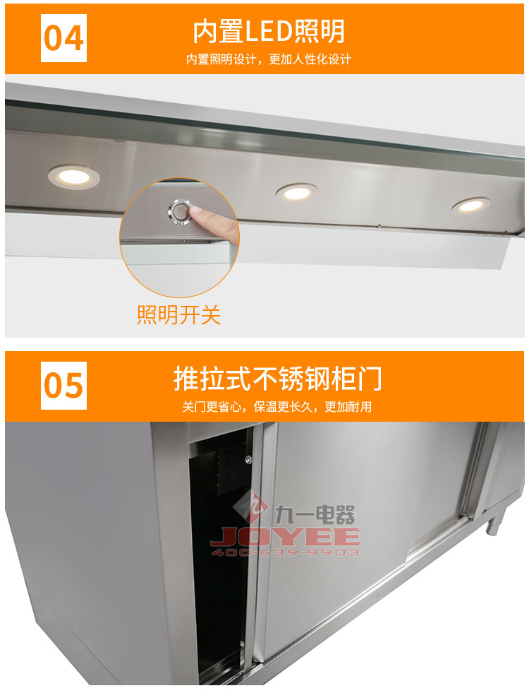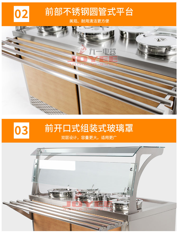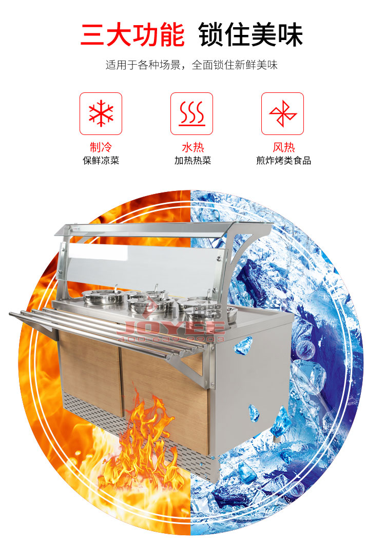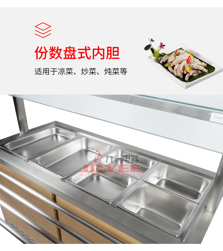 仿木紋裝飾板高端上檔次,前部圓管式平臺(tái)簡(jiǎn)潔大方,前開口式玻璃罩方便傳遞菜品,內(nèi)置LED射燈展示效果更佳,全304不銹鋼柜體,厚度1.2mm板材鍛造堅(jiān)固耐用!