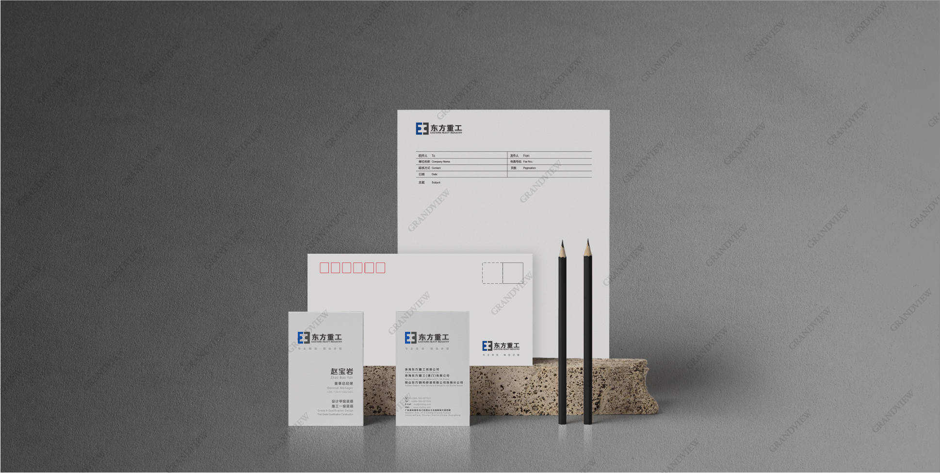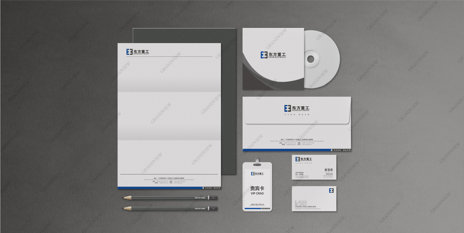 廣角通過梳理所有業(yè)務單元的內容,建立了方便延展使用的品牌架構和VI系統(tǒng)。LOGO以象征穩(wěn)定性的深藍色、深灰色作為主色調,著眼于簡約明了的辨識性標志,同時采用鏡像創(chuàng)意,選取Eastern首字母E之鏡像形成“工”字,個體形態(tài)上中西結合,整體視覺效果詮釋“東方重工”的品牌名稱。